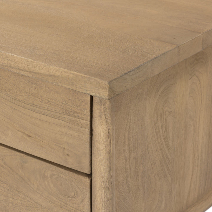 Japandi-inspired mango wood nightstand featuring round tapered legs with cast iron key ring pulls.