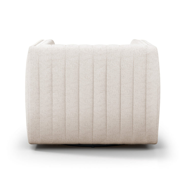 Dramatically channeled upholstery swivel chair.