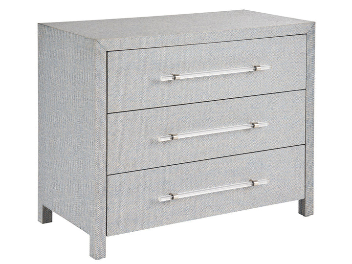 This best selling chest is a stunner with it's blue seagrass wrapped body and long acrylic pulls. Adds a pop of color and storage to any room. Built in electrical functionality.