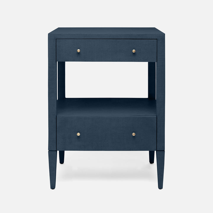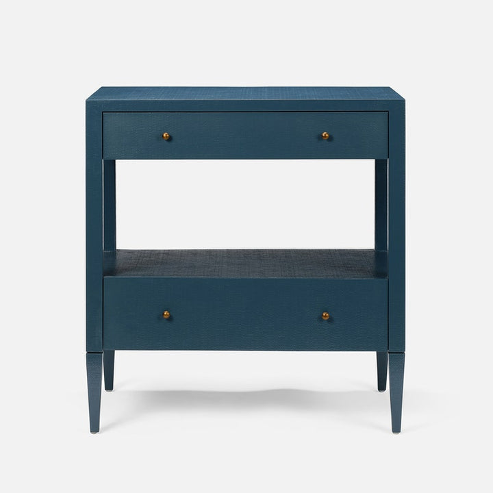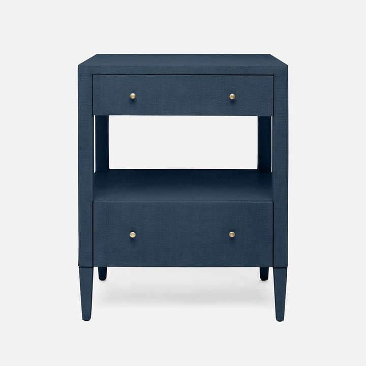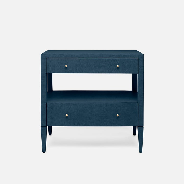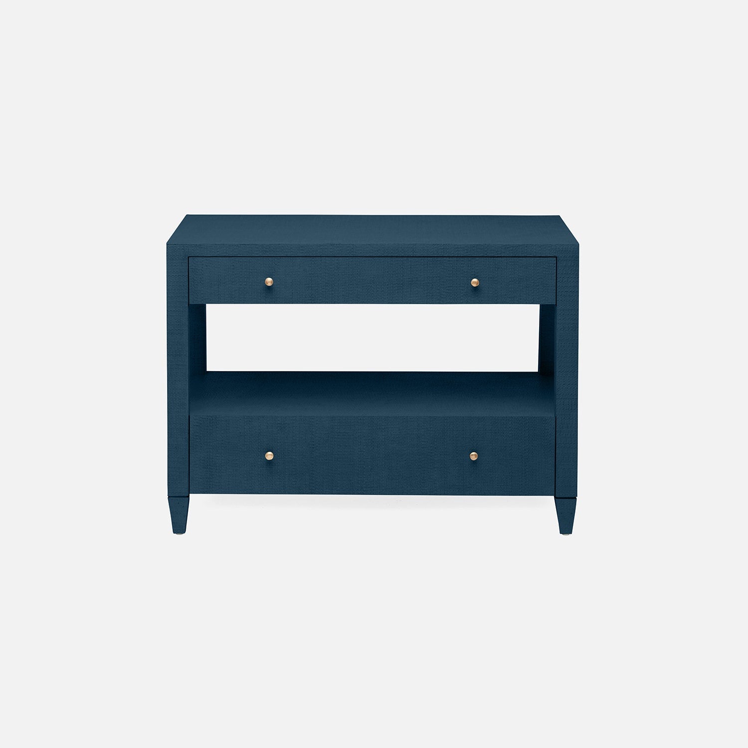 This stunning nightstand is wrapped in elegant, navy blue faux raffia and features wood lined drawers. Available in multiple sizes.