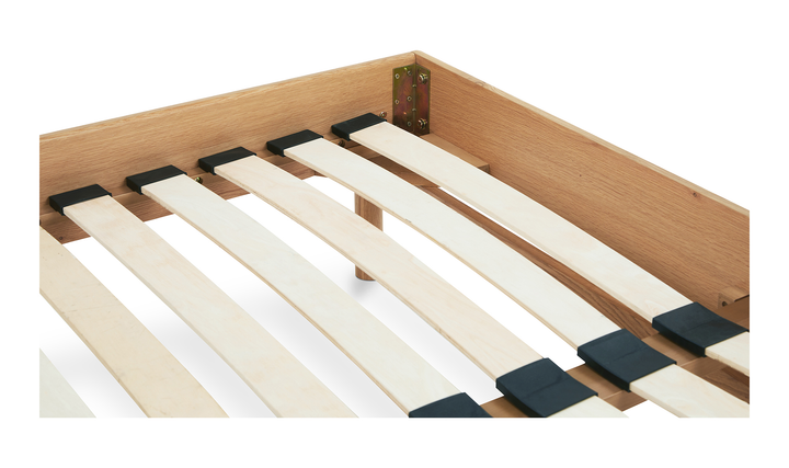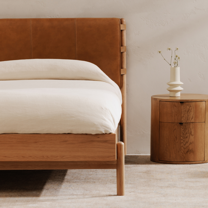 High-quality leather headboard paired with rounded oak legs for a both modern and cozy bed.