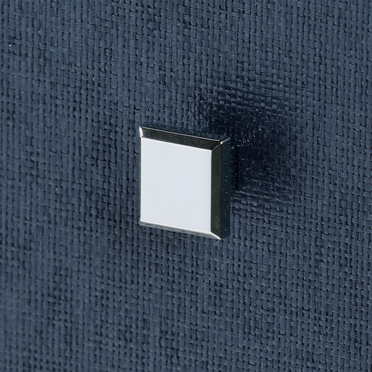 Lacquered grasscloth in deep navy blue. Six drawers on soft-closing glides graduate in size, with two slim top drawers. Features chrome square pulls and richly stained wood interiors.