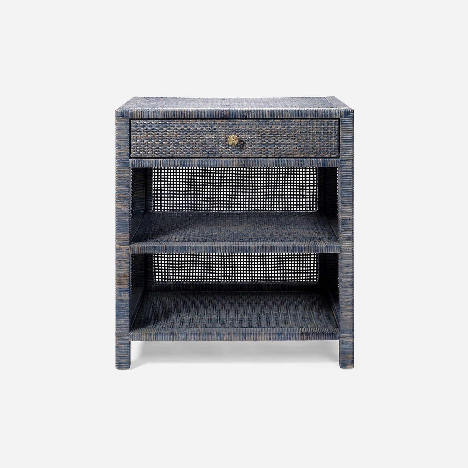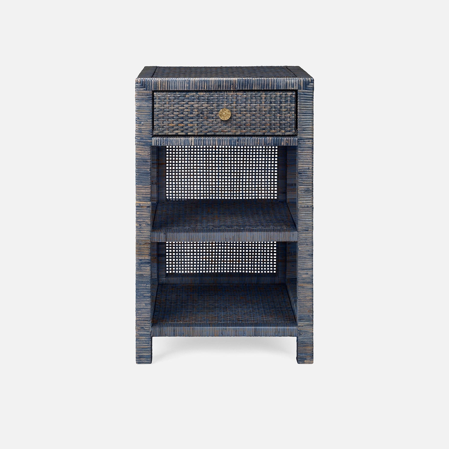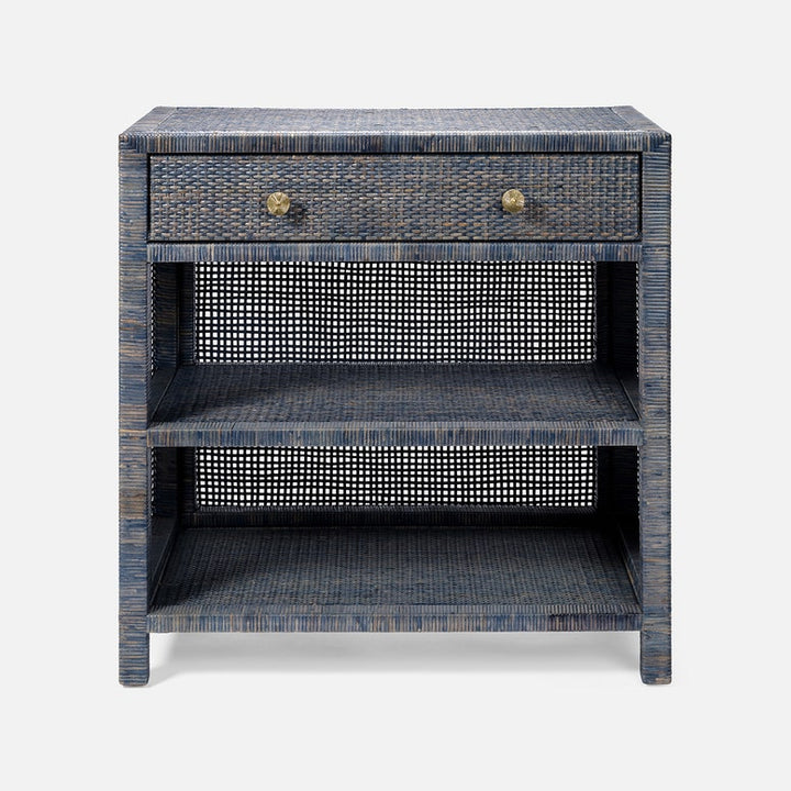 We love the coastal feel of the varying blue hues in this tightly woven rattan nightstand. Features two shelves, a wood interior soft-close drawer and gold flower-shaped knob. Available in multiple sizes.