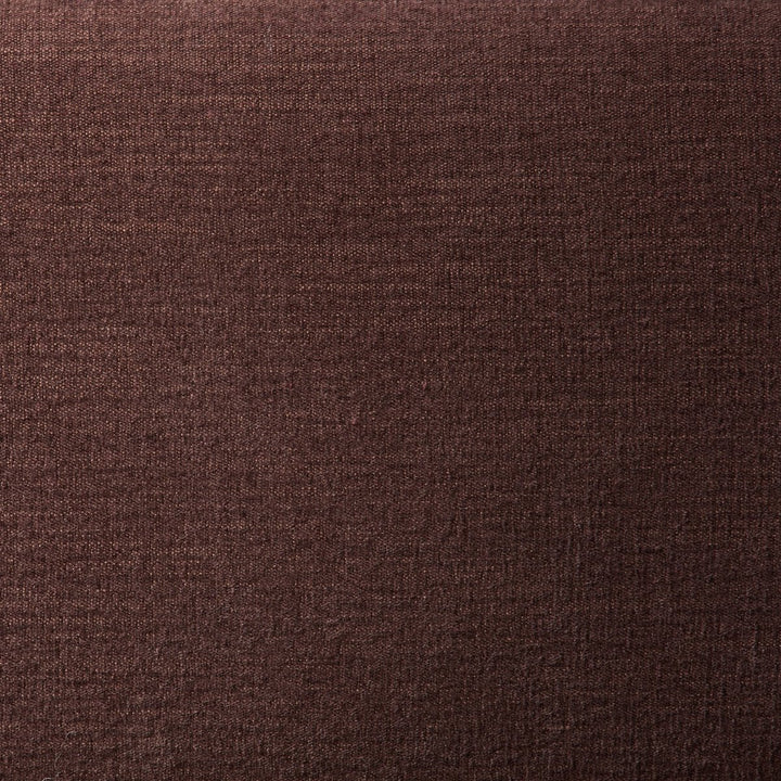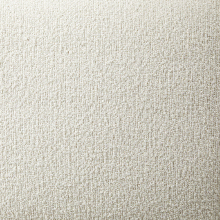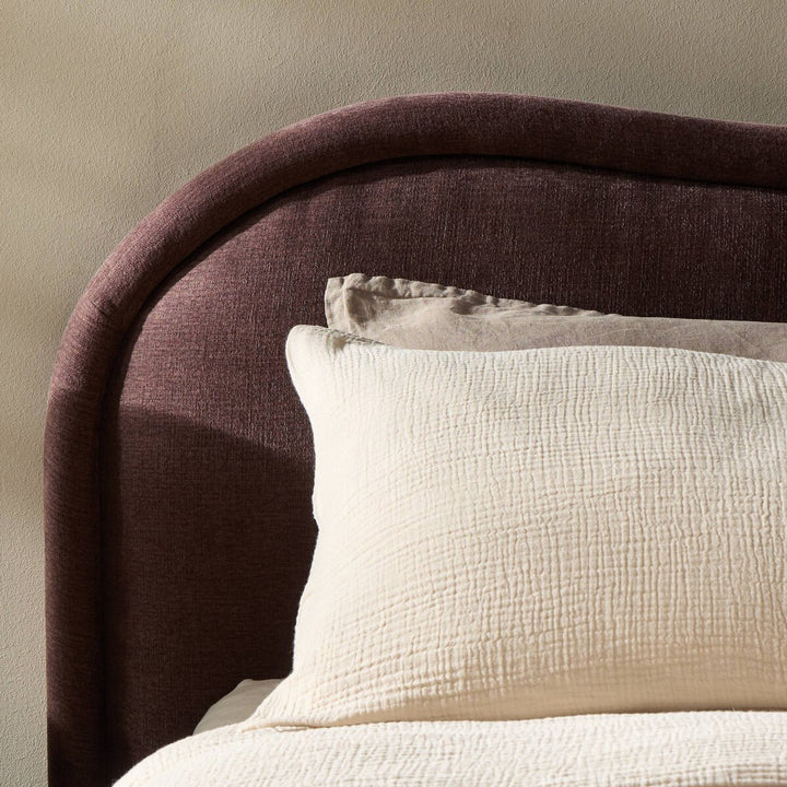 Platform bed with a curved headboard. Upholstered in performance, textured fabric.