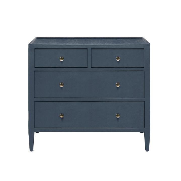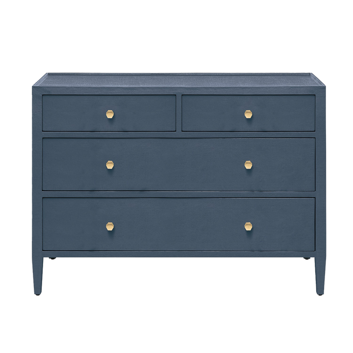Perfect blend of style and functionality. Fully finished on all sides in navy faux Belgian linen finish. Available in 2 sizes with four drawers.