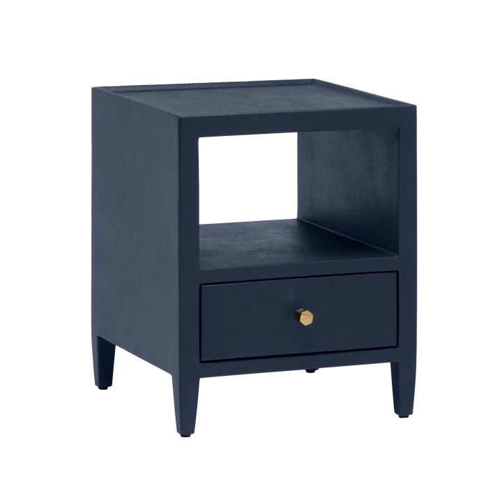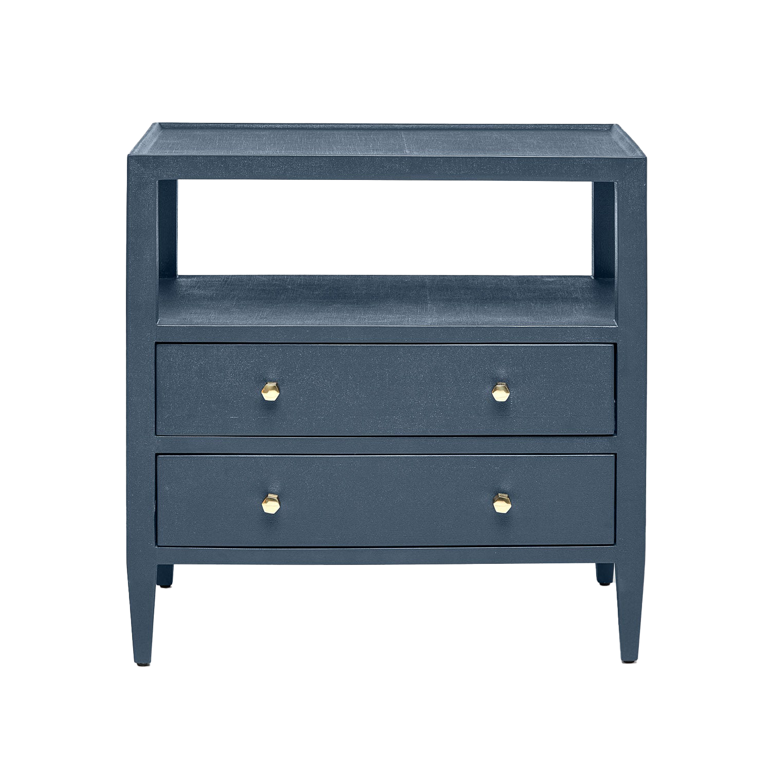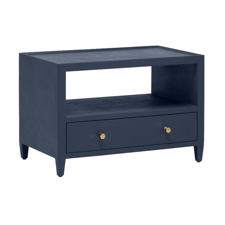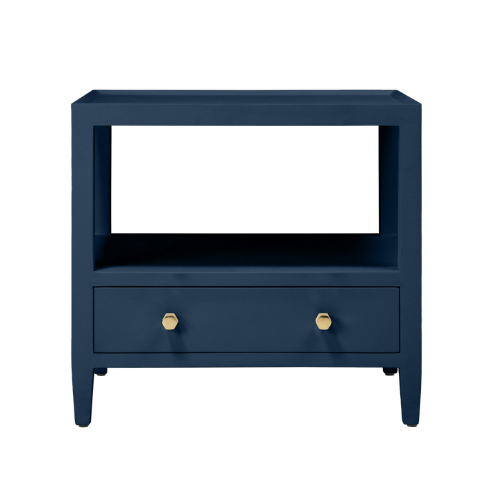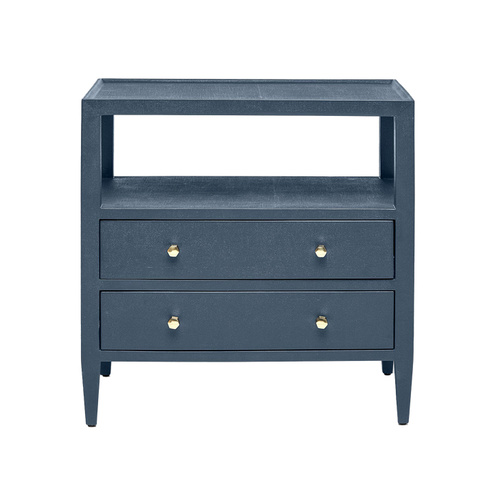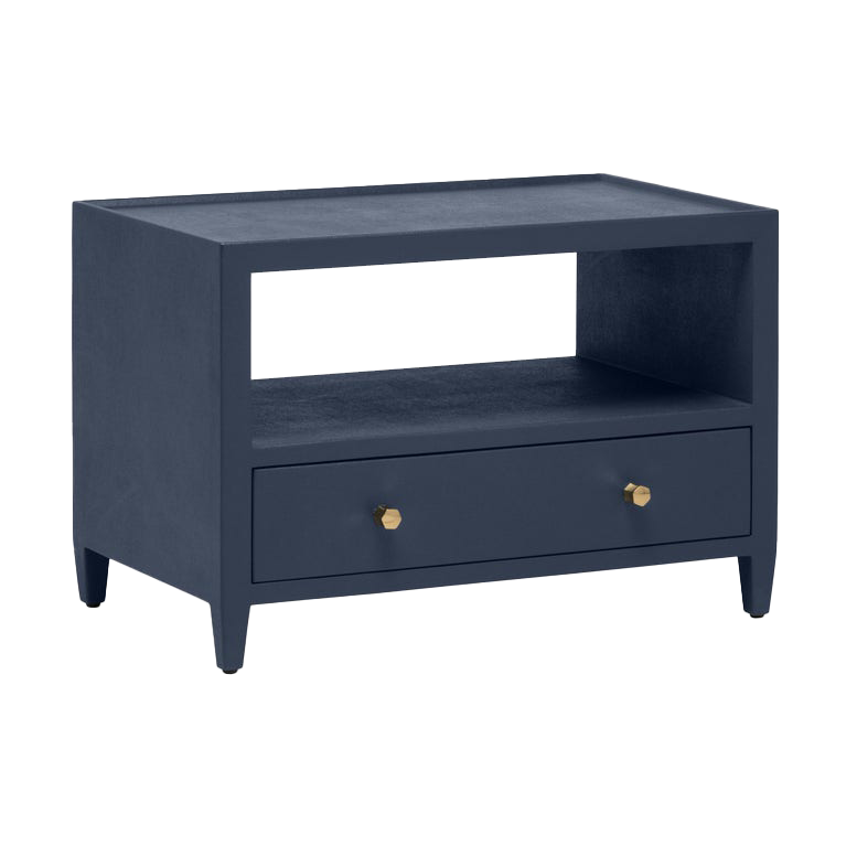 Perfect blend of style and functionality. Fully finished on all sides in navy faux Belgian linen finish. Available in 6 sizes, with either one or two drawers.