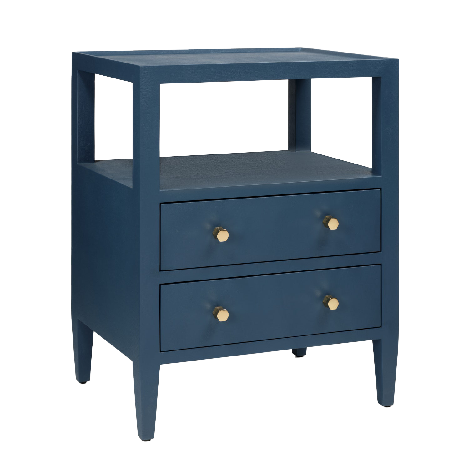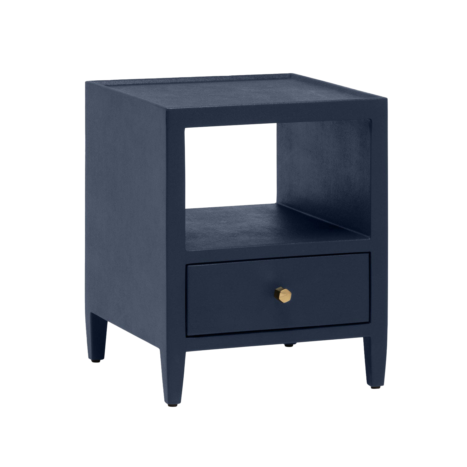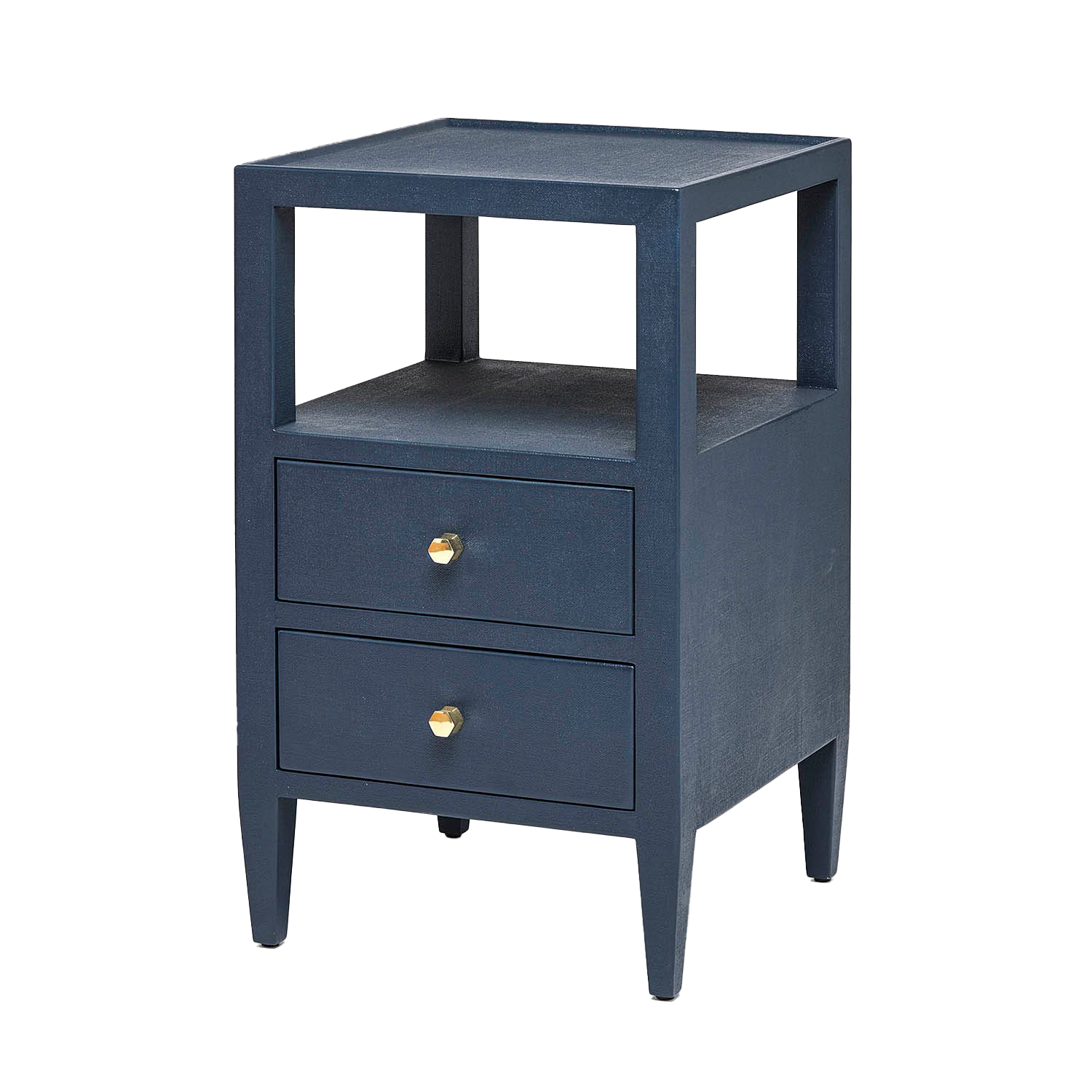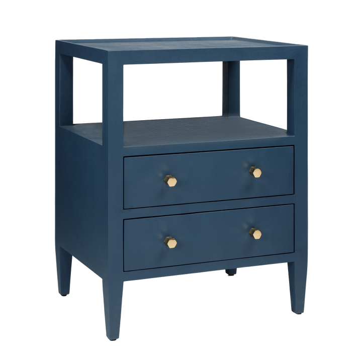 Perfect blend of style and functionality. Fully finished on all sides in navy faux Belgian linen finish. Available in 6 sizes, with either one or two drawers.