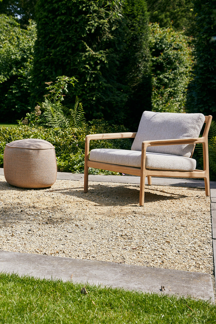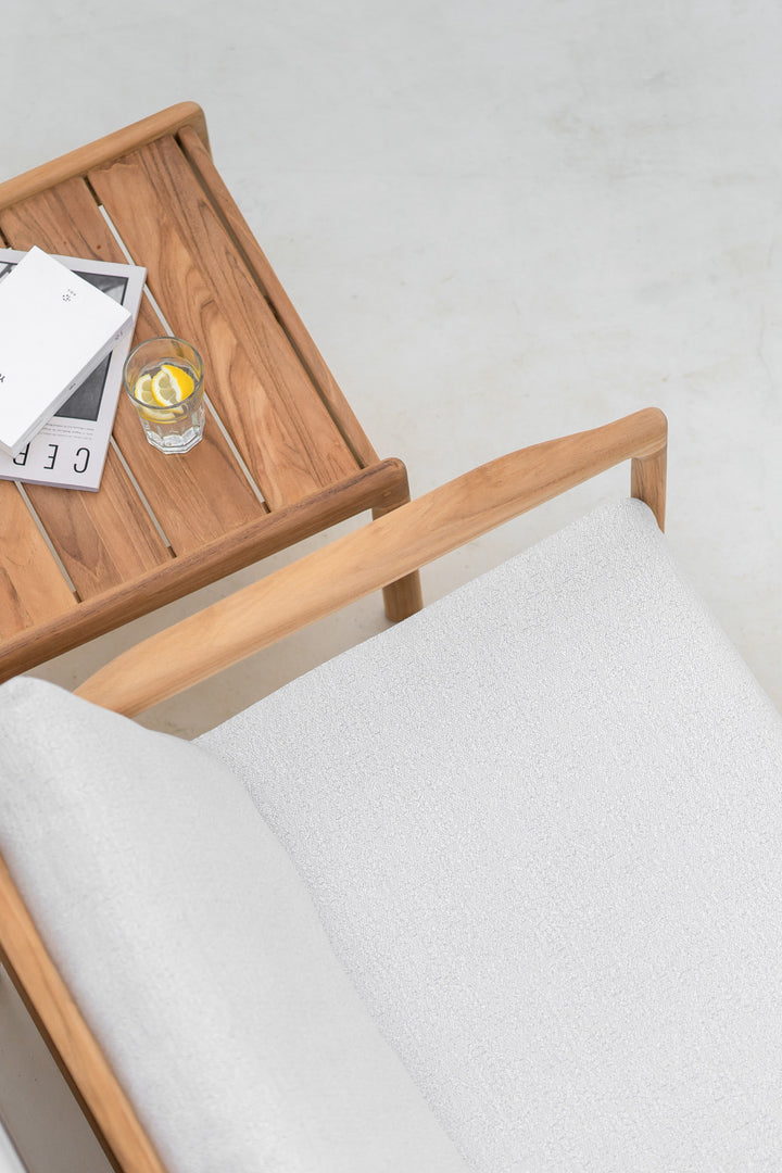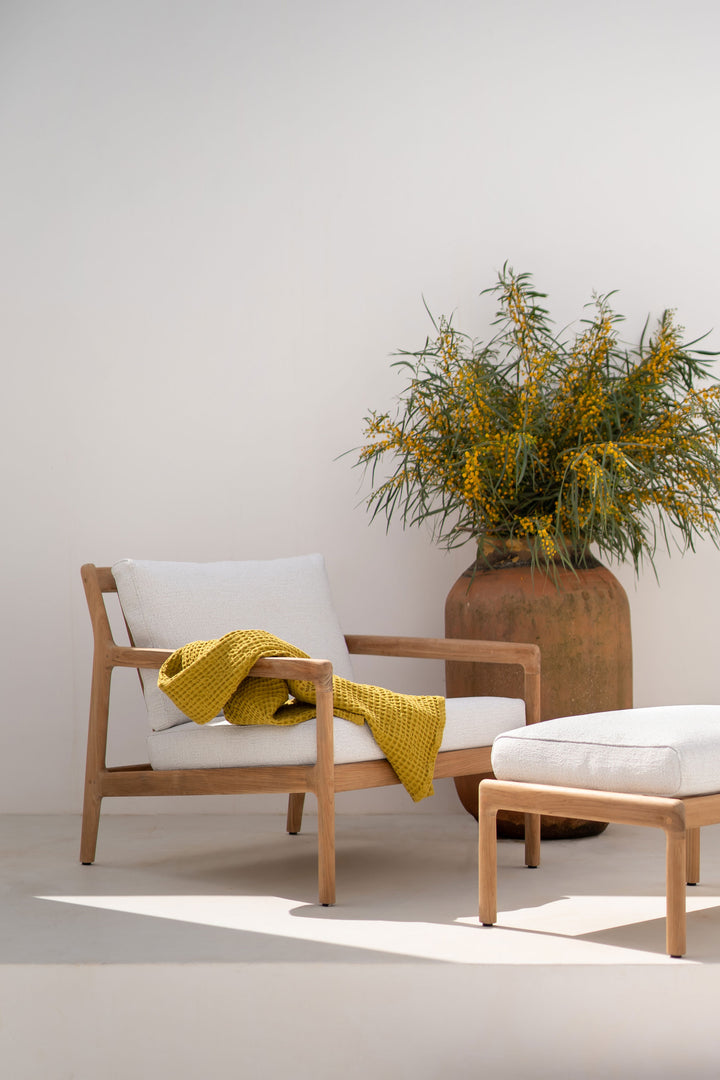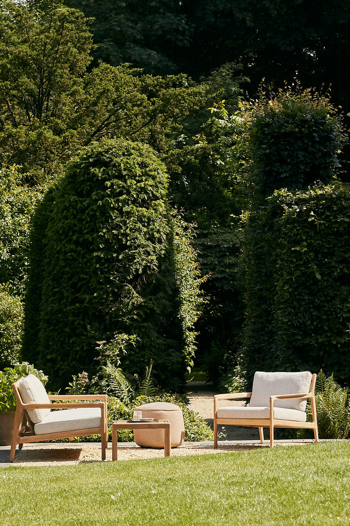 Solid teak wood frame with off-white cushions. Organic curves and classic lines for that modern touch.