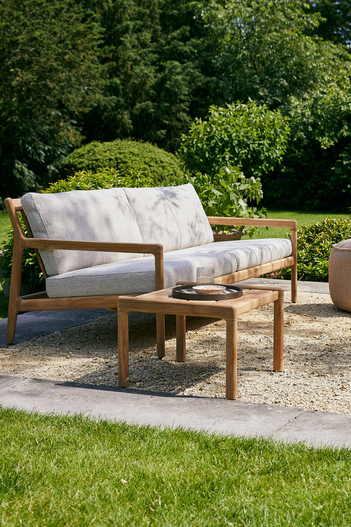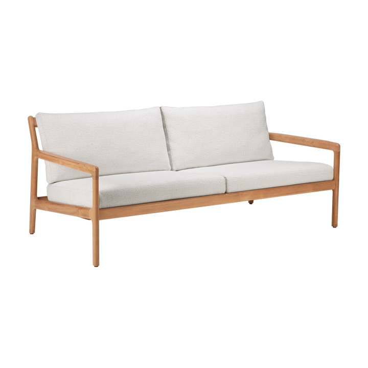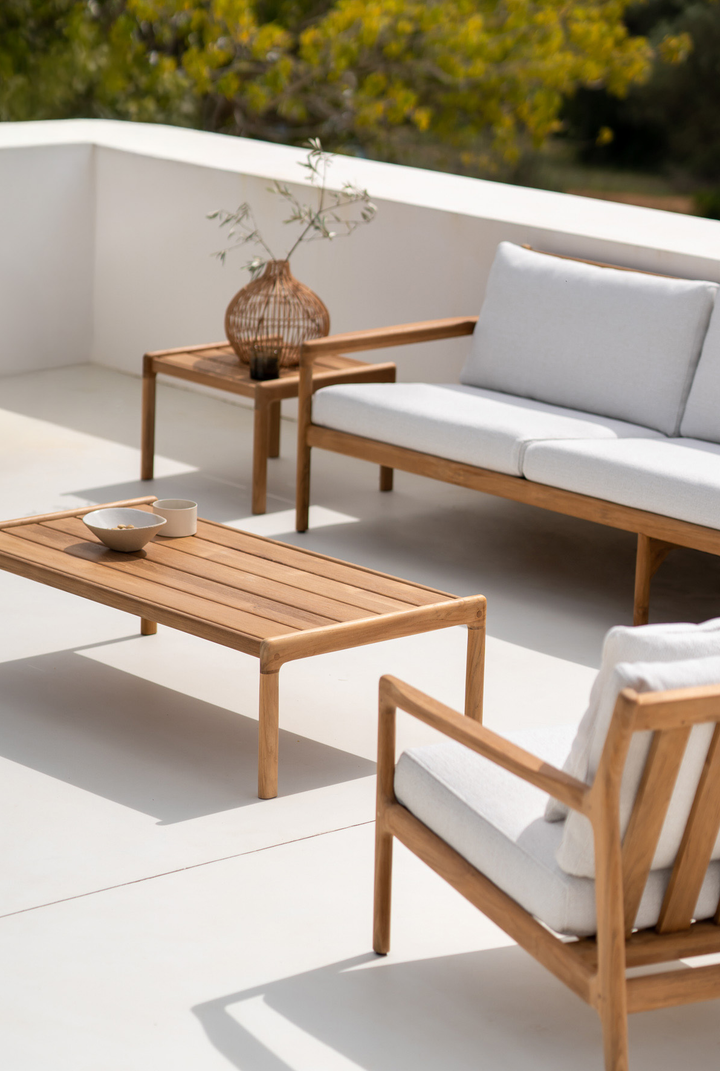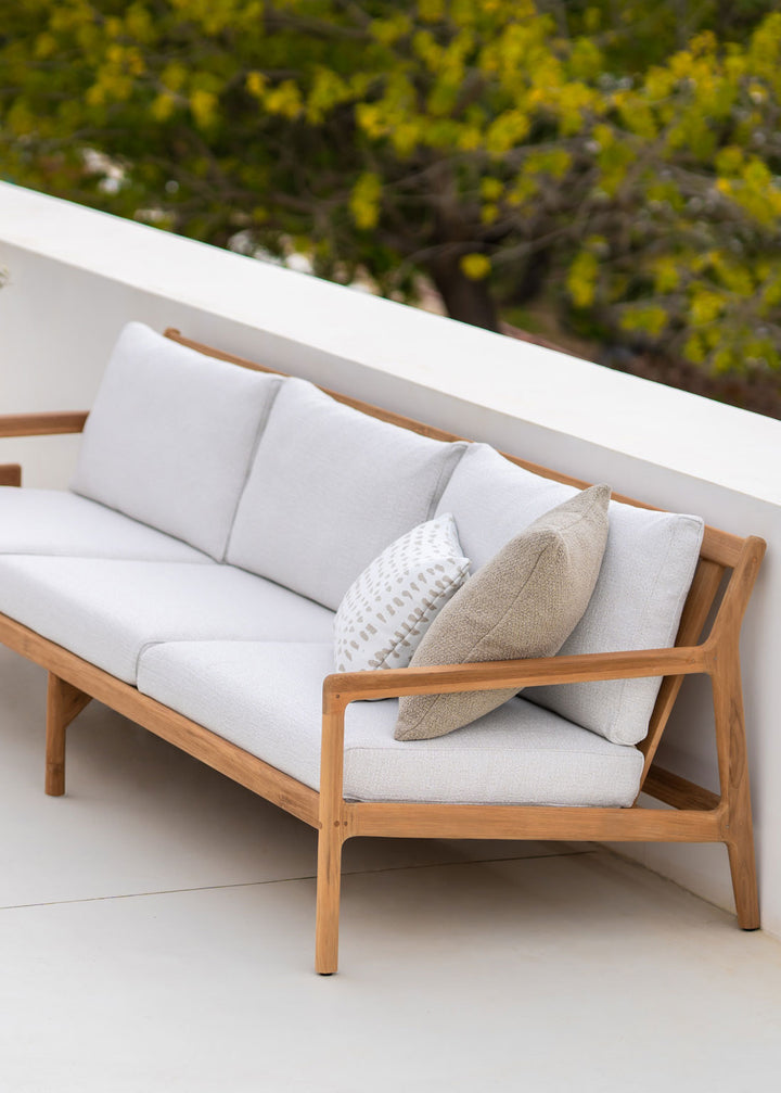 Solid teak wood frame with off-white cushions. Organic curves meet modern lines for ultimate comfort and support.