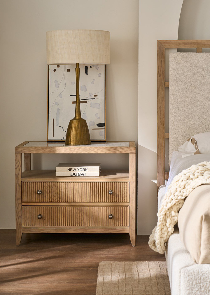 This elegant two-drawer nightstand features metal ring pulls, vertical groove detail and an open shelf accented by an inset stone top that give it a luxurious touch. White oak for that warm organic modern feel.