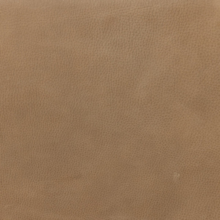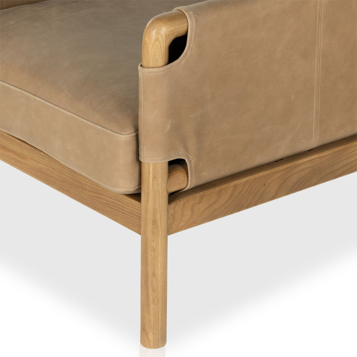 A cylindrical frame is crafted, smoothed and rounded from solid ash wood. Includes two loose feather-blend cushions covered in subtly distressed thick cut leather in a neutral taupe hue for a monochromatic look.