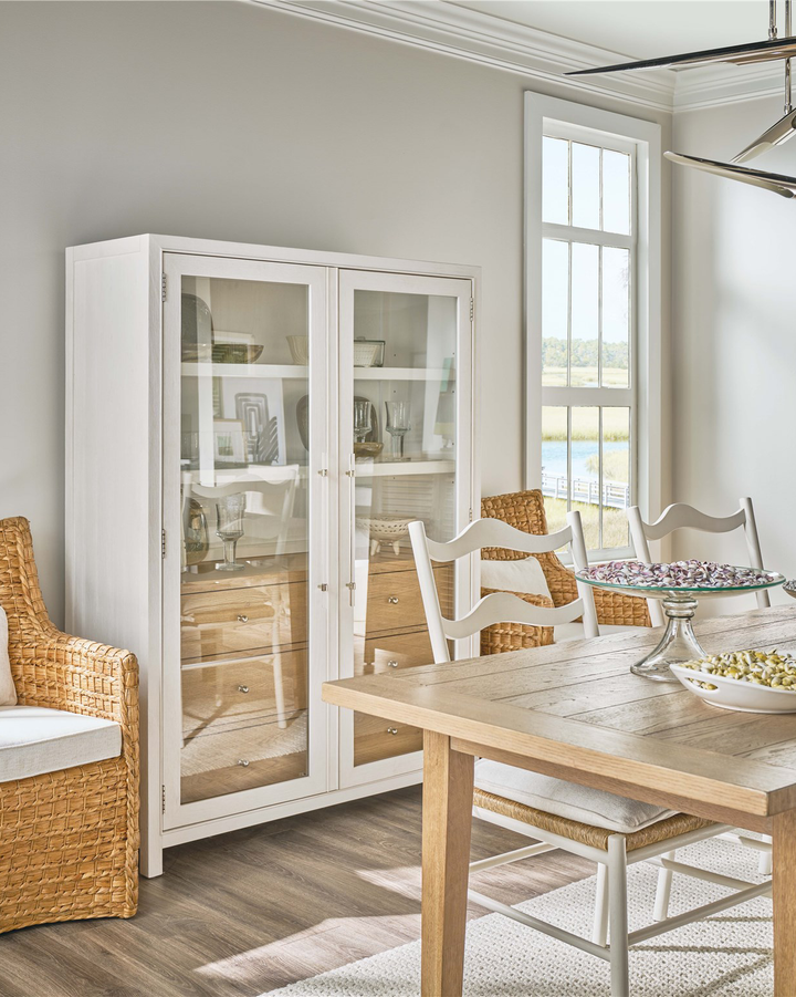 Tall framed, this cabinet features a mix of drawers and open shelves, and two glass doors for a light and airy feel. The sand dune finish of the drawer insert and white wash finish of the cabinet frame exudes a beach-y vibe.