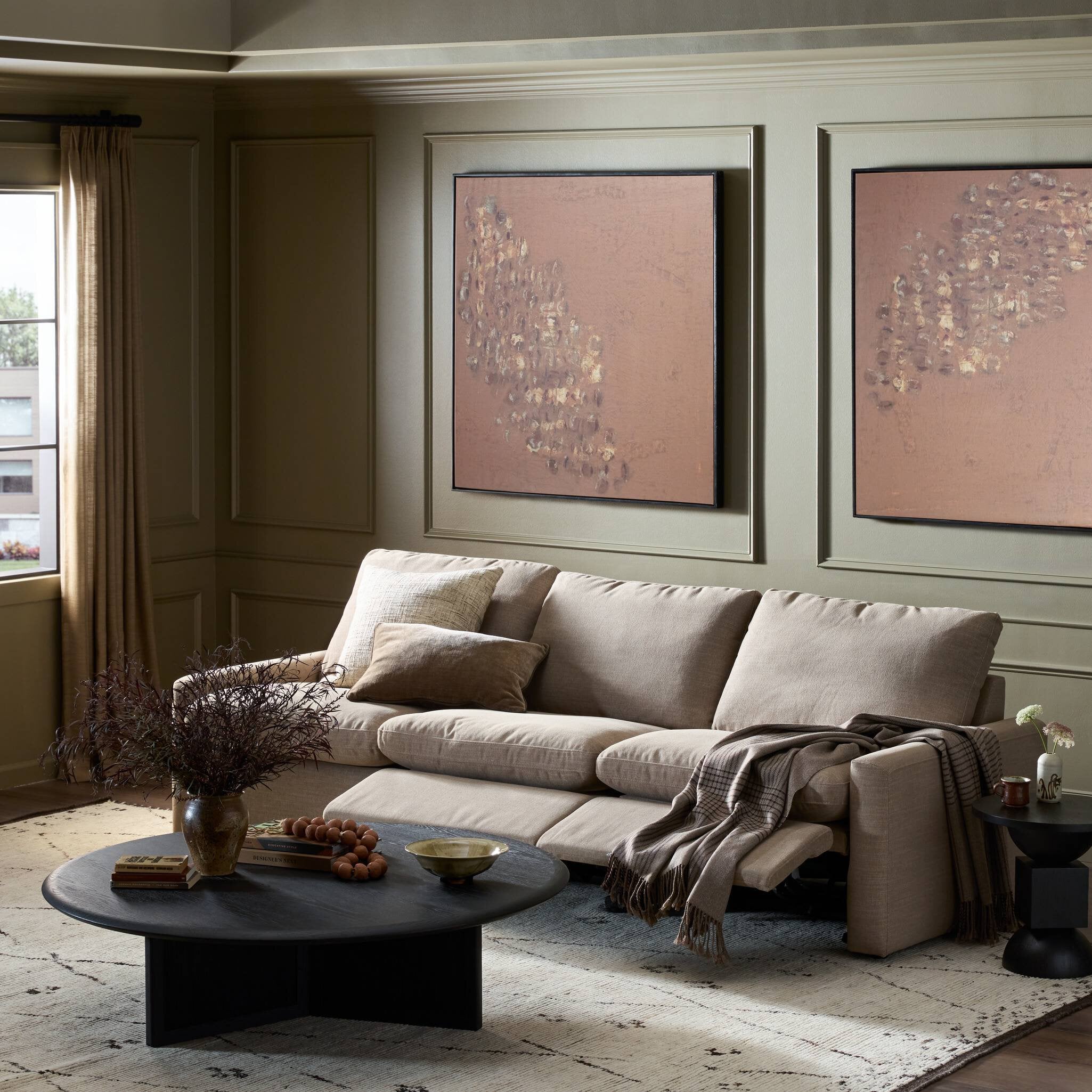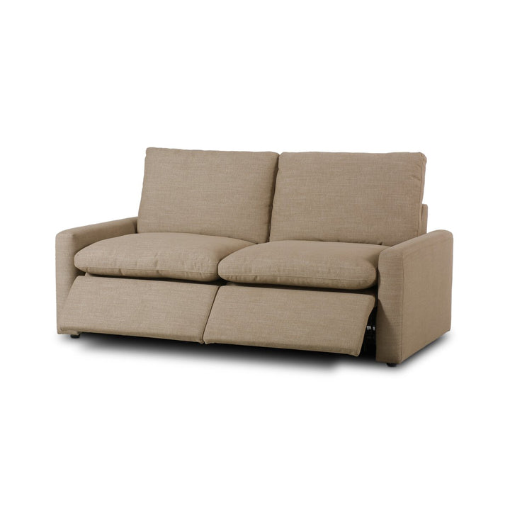 We searched for a comfortable reclining sofa that had great style. A modern take on the traditional recliner, hidden buttons operate the motion function. The sofa features a slightly higher seat and backrest, low, sleek arms, and a motion footrest. Plush feather-blend cushions create a relaxed look and feel. Its zero-clearance design allows the sofa to be placed up against a wall.