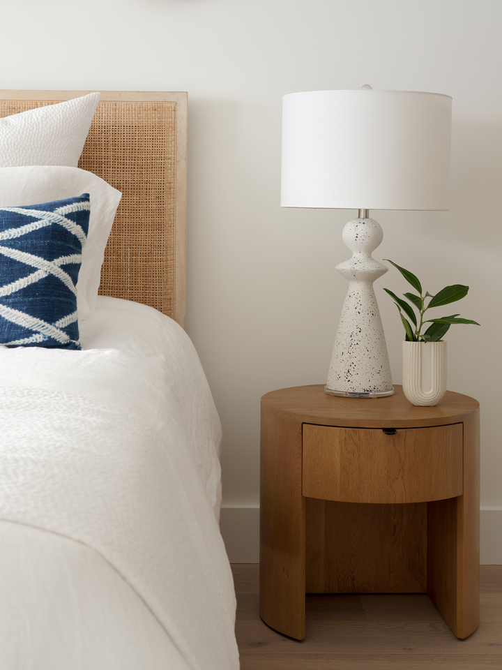 Rounded oak looks great with any bed. Soft-close drawers for storage.