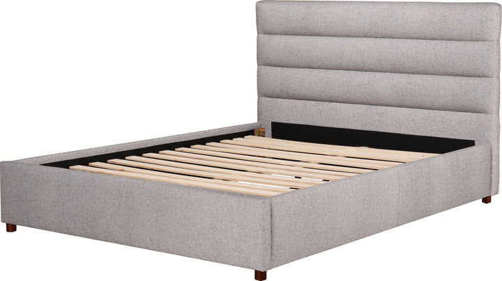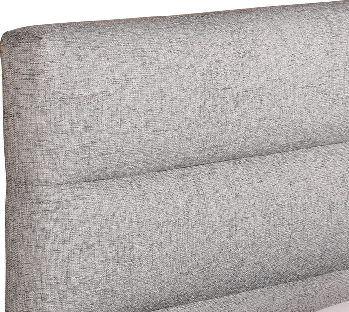 Solid wood construction. Soft, woven grey performance upholstery with foam padded, channeled headboard.