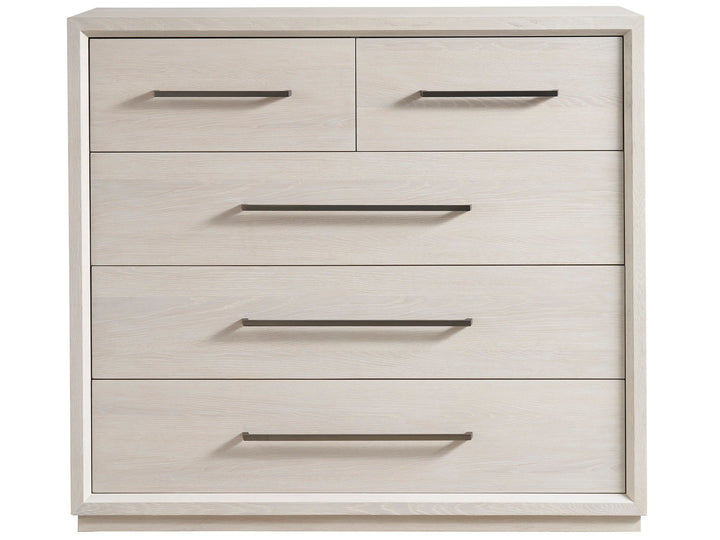 Whitewashed white oak with clean modern lines, 5 drawers, matte pewter colored hardware.